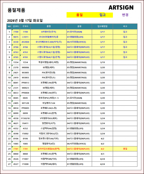 품절 / 입고 ] 2026년 3월 17일