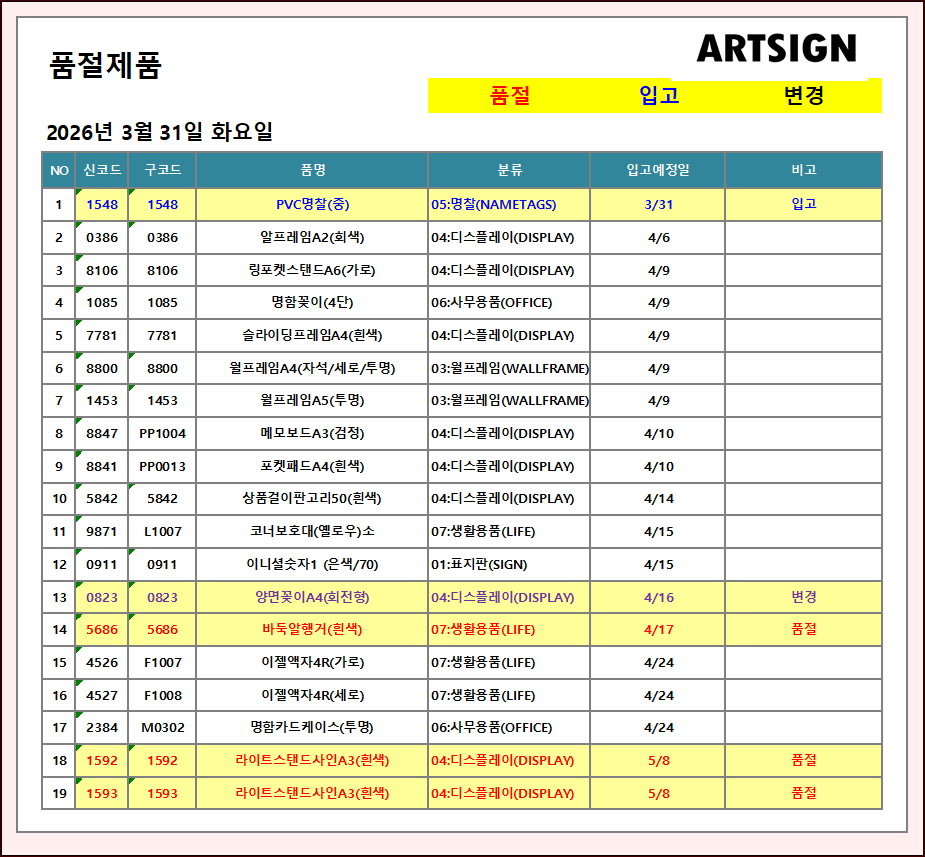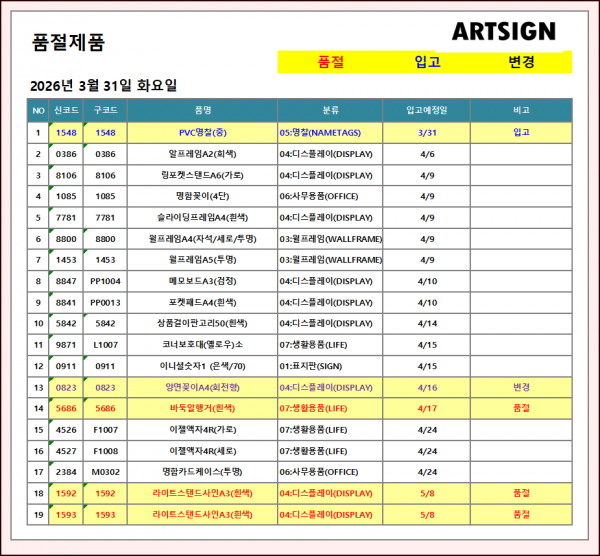 품절 / 입고 / 변경 ] 2026년 3월 31일