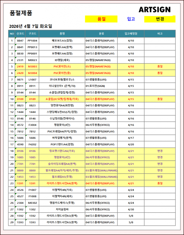 품절 / 변경 ] 2026년 4월 7일