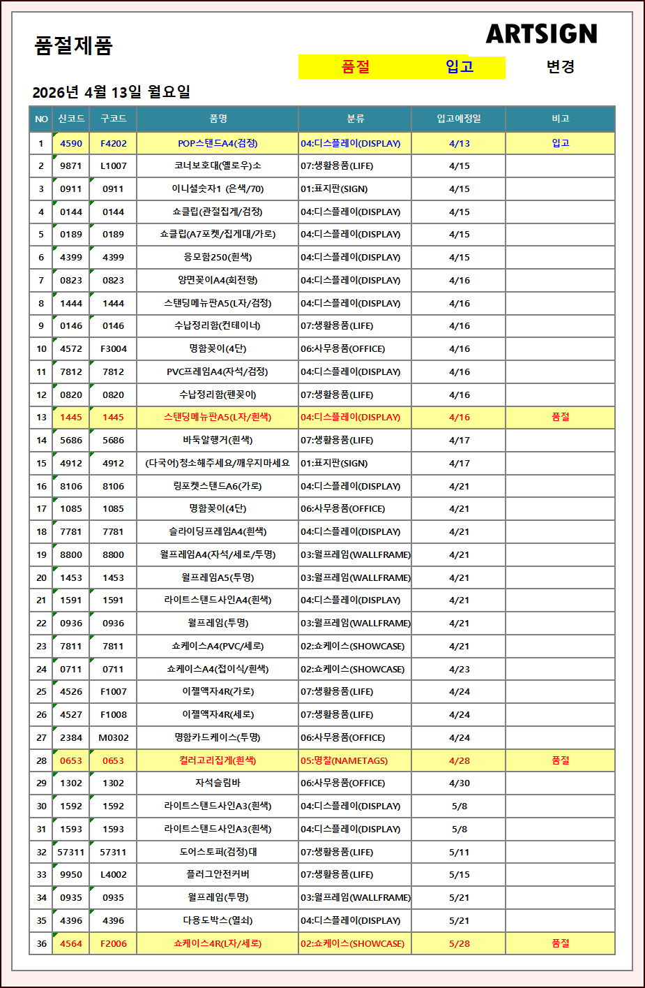 품절 제품과 입고 된 제품에 대해 안내 드립니다.