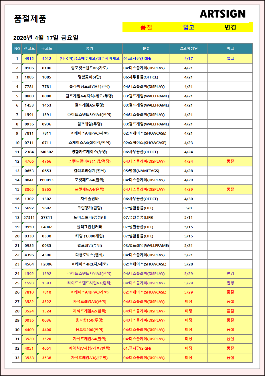 품절 / 입고 / 변경 ] 2026년 4월 17일
