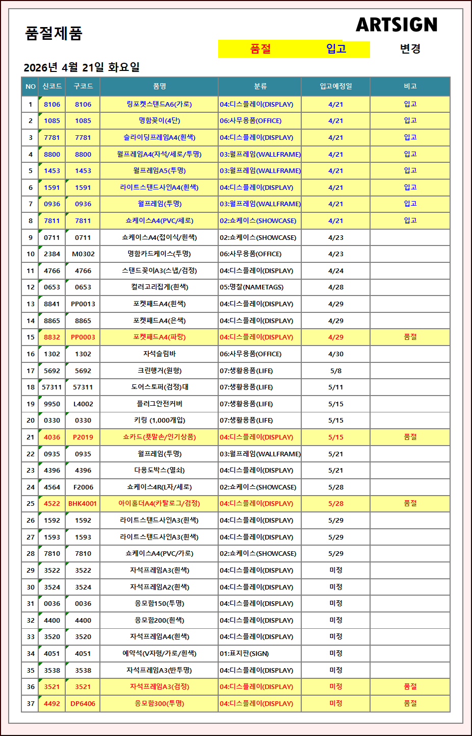 품절 제품과 입고 된 제품에 대해 안내 드립니다.