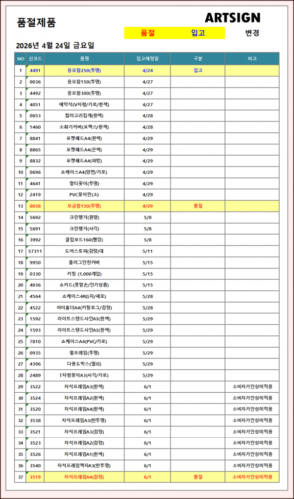 품절 제품과 입고된 제품에 대해 안내 드립니다.