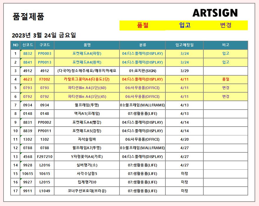 품절 / 입고 / 변경 ] 2023년 3월 24일