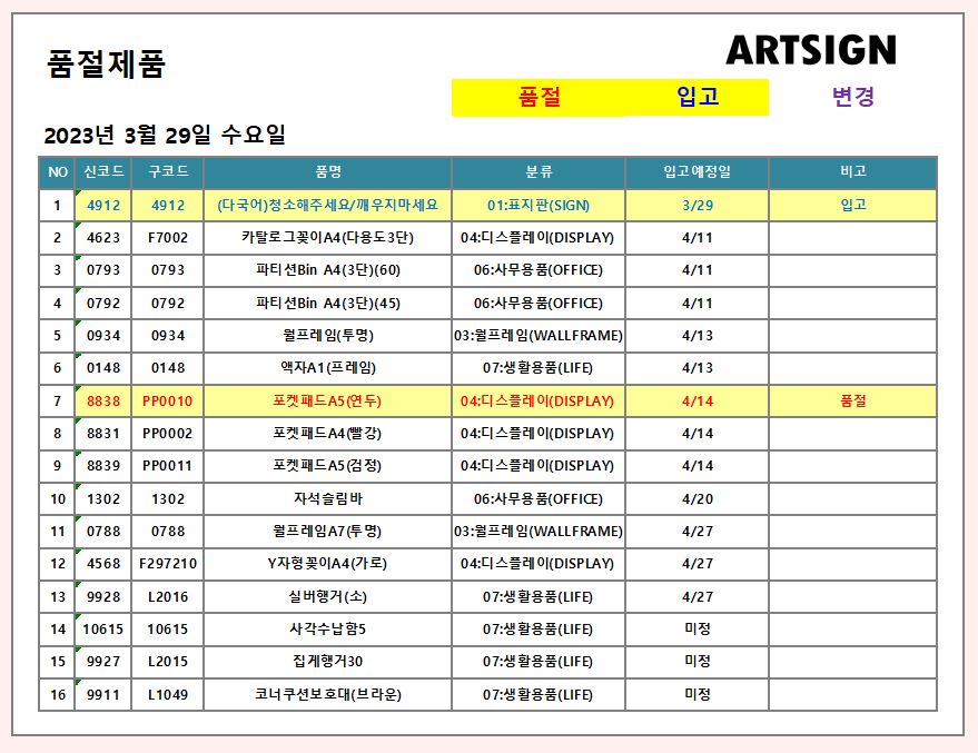 품절 / 입고 ] 2023년 3월 29일