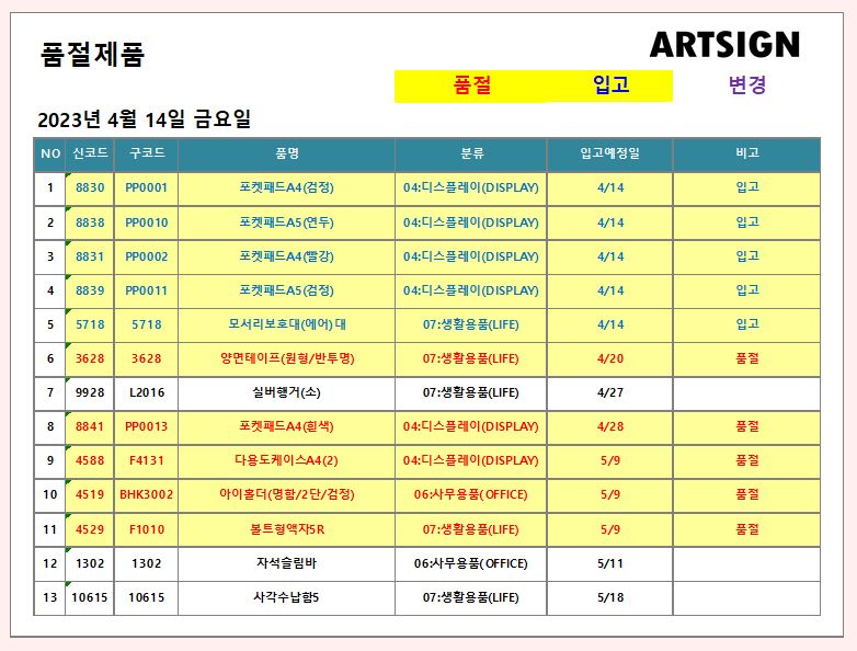 품절 / 입고 ] 2023년 4월 14일