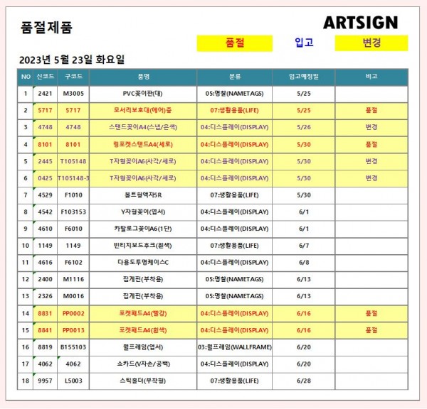 품절제품과 입고일이 변경된 제품에 대해 안내드립니다.