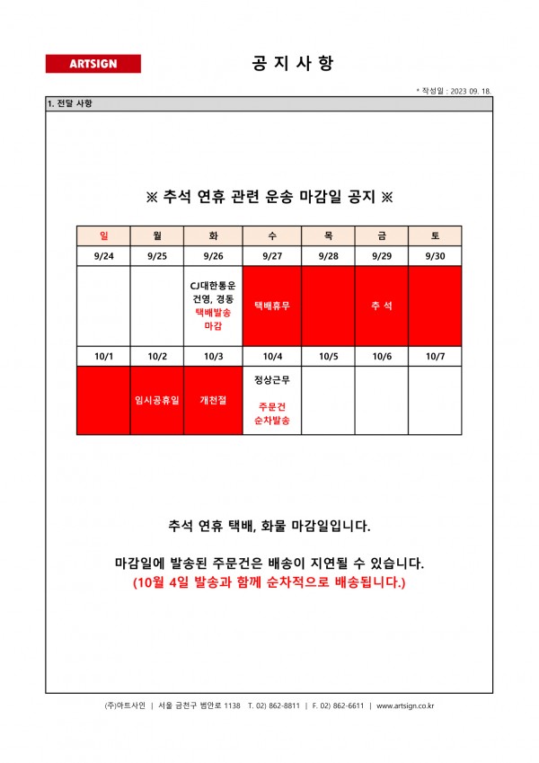 2023년 추석 연휴 운송 마감일 공지입니다.