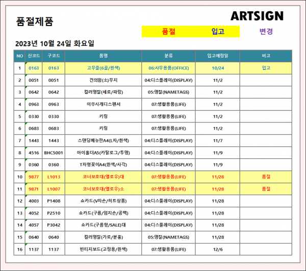 품절제품과 입고된 제품에 대해 안내드립니다.