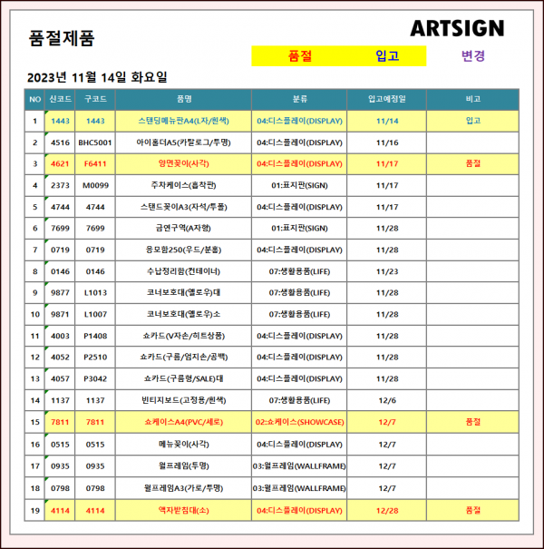 품절 / 입고 ] 2023년 11월 14일