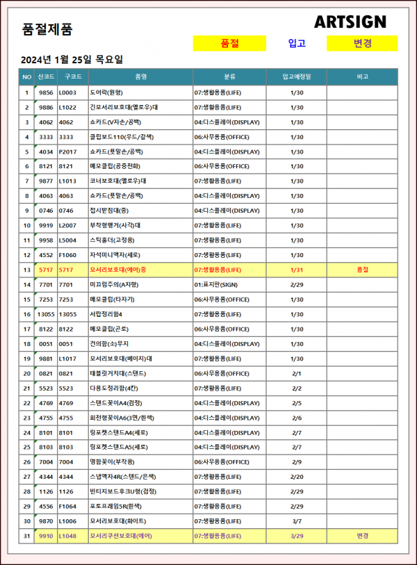 품절 제품과 입고일이 변경된 제품에 대해 안내드립니다.