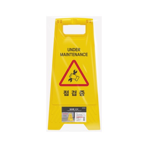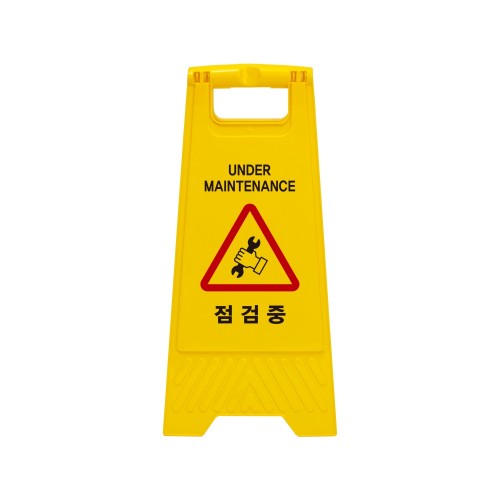 선명한 색상의 주목성이 뛰어난 A자형 표지판입니다. 시설이나 기계등이 점검중임을 알려줍니다.