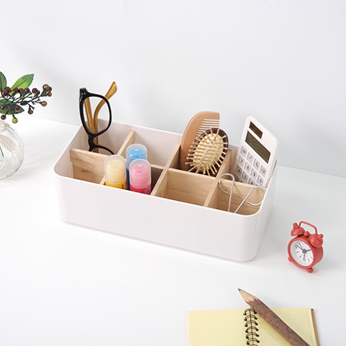 데스크 위에 화장품들이나 리모컨, 기타 사무용 소품 등을 깔끔하게 정리할 수 있는 다용도 원목수납함입니다.