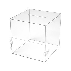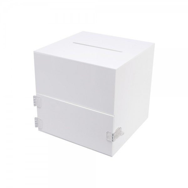흰색 아크릴 케이스 모금함입니다.경첩이 부착되어 있어 내용물을 쉽게 뺄 수 있습니다.