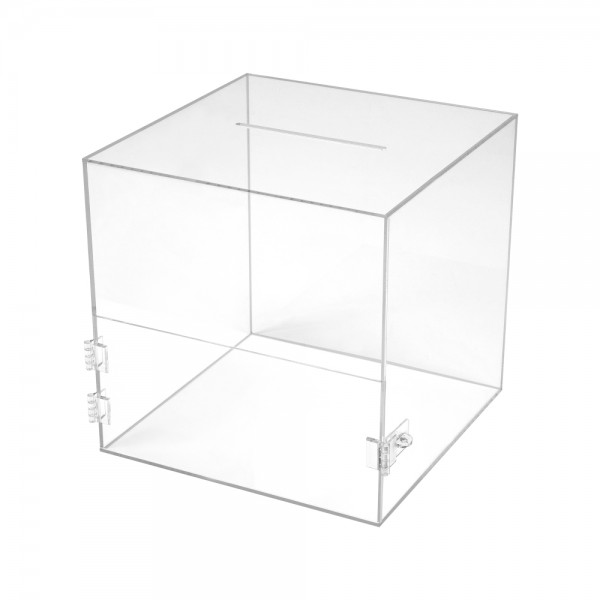 투명 아크릴 케이스 모금함입니다.경첩이 부착되어 있어 내용물을 쉽게 뺄 수 있습니다.